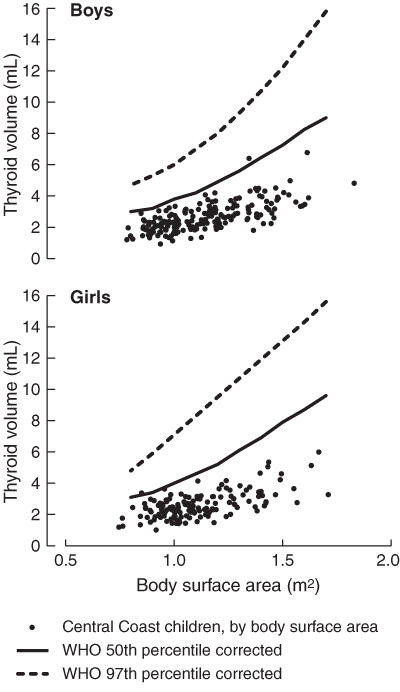 Results: Median UIC for school children was 82 μg/L, and 14% of children had UICs below 50 μg/L. Thyroid volume reference values indicated a prevalence of goitre of zero. In girls, only four (3%) and one (1%) had thyroid volumes above the WHO/ICCIDD medians by age and body surface area (BSA), respectively (P < 0.001). In boys, three (2%) and one (1%) had thyroid volumes above WHO/ICCIDD medians by age and BSA, respectively (P < 0.001).