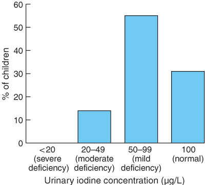 Main outcome measures: Thyroid volumes compared with World Health Organization/International Council for the Control of Iodine Deficiency Disorders (WHO/ICCIDD) thyroid volume reference values. Iodine status based on WHO/ICCIDD urinary iodine concentration (UIC) categories (normal, ≥ 100 μg per litre of urine [μg/L]; mild iodine deficiency, 50–99 μg/L; moderate deficiency, 20–49 μg/L; severe deficiency, < 20 μg/L); not more than 20% of the population should have a UIC below 50 μg/L.