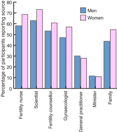 Over 90% of respondents indicated they would seek outside help to decide the fate of their embryos, with only six women and nine men saying they would not seek help (Box 3). Healthcare professionals with expertise in IVF were reported as most likely to be asked for assistance. There were no differences between men and women in their responses.
