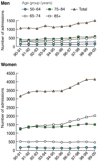 Between July 1990 and June 2000, the number of admissions to NSW acute-care hospitals for hip fracture increased by 41.9% in men (from 1059 to 1503) and by 31.2% in women (from 3160 to 4145) (Box 1). The increase was highest among those aged 85 years and over in both men (75.8% increase) and women (61.3% increase). Women aged 65–74 years were the only group with a decrease in number of admissions for hip fracture (− 10%).