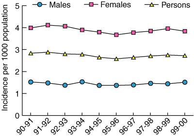 Hip fracture rates were calculated as the number of cases per 1000 population per year, by sex and age group. Population figures for each age group were obtained from the Australian Bureau of Statistics census for the years 1991 and 1996, and from estimates of the NSW population for other years of the study.15