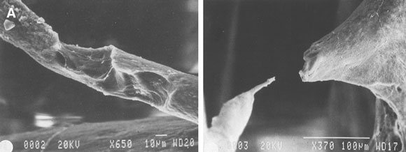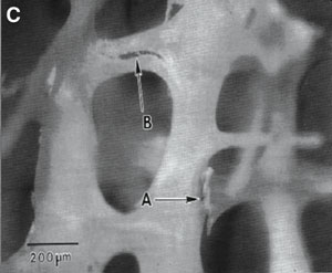 C. Microcracks in the trabeculae (arrows) (reprinted from Fyhrie and Schaffler, 9 with permission from Elsevier). |