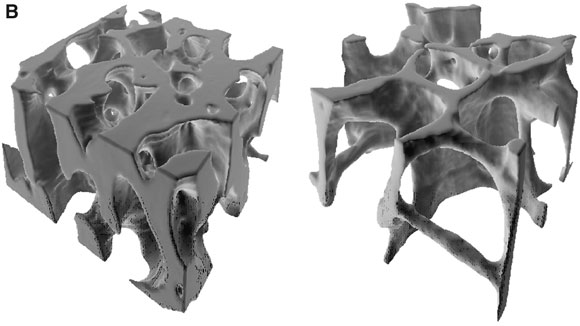 B. Loss of trabeculae and thinning (right) reduce cross-sectional area so that loads on bone are relatively greater (reprinted from Keaveny et al 8 with permission from Annual Review of Biomedical Engineering [www.annual.reviews.org]).