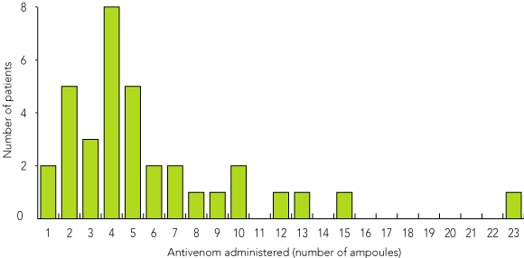 Box 2 shows the number of ampoules of antivenom received before return of detectable fibrinogen against the numbers of patients who received that dose. The dose of antivenom given before venom neutralisation ranged from one to 23 ampoules. After five ampoules of antivenom, venom neutralisation was achieved in two-thirds of envenomed patients (66%), and after 10 ampoules, 89%. Ten patients received further doses of antivenom after the return of detectable fibrinogen levels.