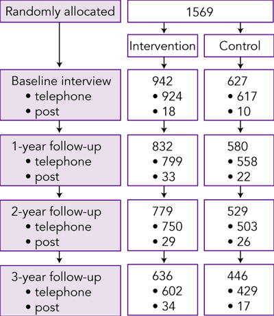 Participation in each stage of the trial is shown in Box 2. A total of 1569 veterans and war widows completed a baseline interview between December 1997 and April 1998 and were randomised to the intervention (n = 942) or control (n = 627) groups. Within the intervention group, 237 participants were allocated to Group 1, 237 to Group 2, 231 to Group 3, and 237 to Group 4.
