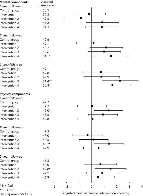 Box 4 shows results of the analysis of the effect of intensity and frequency of intervention. For Mental Component Summary scores, there was a consistent trend in favour of groups which received 6-monthly visits (Groups 3 and 4), with differences in adjusted mean scores of up to 2.3 points.