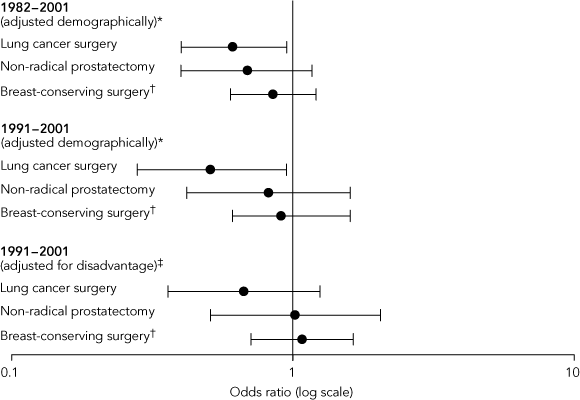 * Odds ratios for 1982–2001 and 1991–2001 (first analysis) were adjusted demographically for patient age, Box–Tidwell transformation of age, calendar period, Charlson index and marital status. The lung cancer analyses were also adjusted for sex and histological type. † For the breast cancer analyses, the periods examined were 1982–2000 and 1991–2000, respectively, rather than 1982–2001 and 1991–2001.