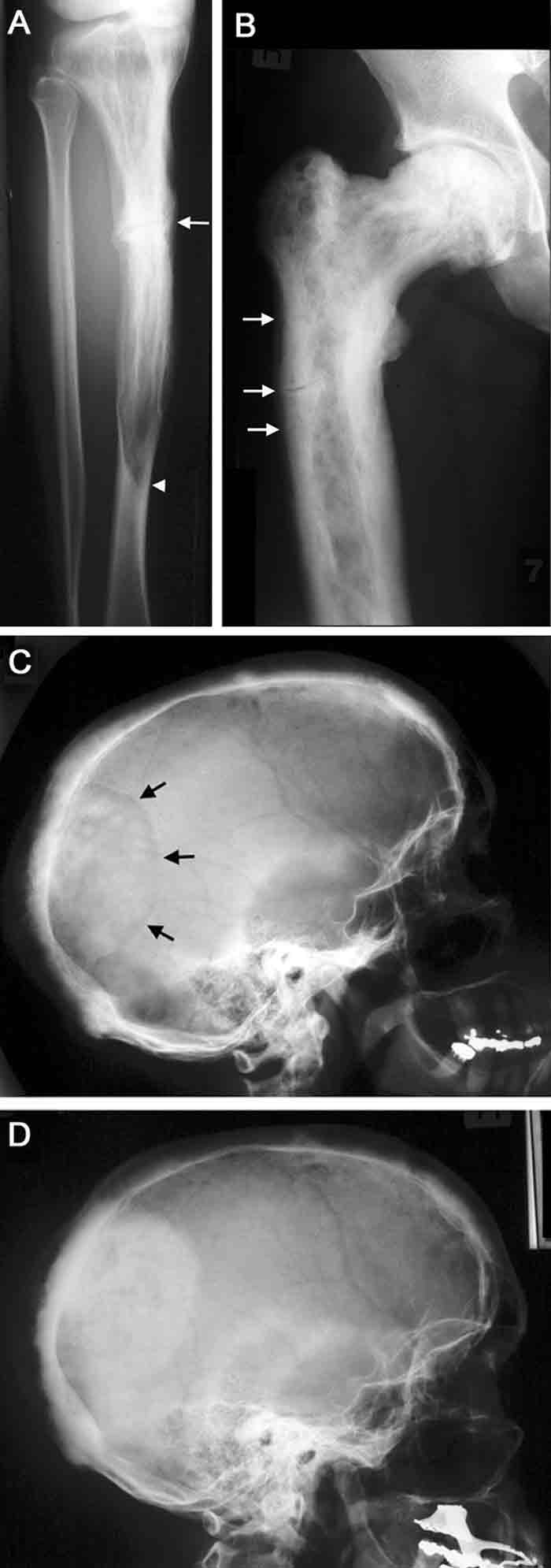 Pagetic bone pain occurs in a minority of patients. Sometimes this has distinct characteristics, being constant (day and night), present at rest and poorly localised, with a dull, boring character. Other patients have more localised pain, worse on weight-bearing and sometimes self-limiting, which may arise from microfractures or localised lytic lesions. Paget’s disease adjacent to a joint can cause secondary arthropathy with the clinical features of osteoarthritis. Deformity, such as bowing of the femur or tibia, may be asymptomatic or associated with mechanical pain in the affected limb or on the contralateral side, arising from secondary gait problems. Cortical fissure fractures arise from abnormal mechanical forces on weakened bone. They may be asymptomatic or painful. They often remain unchanged over time with no response to treatment, but can progress to complete fracture (Box 2).