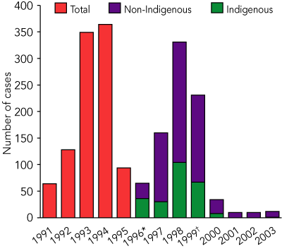 * Enhanced surveillance with systematic collection of Indigenous status began in 1996. † The vaccination program began in February 1999, and was rolled out progressively over that year.