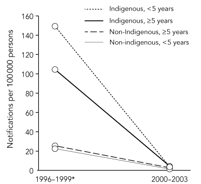 There was a rapid and marked decline in notifications of hepatitis A after the roll-out of the vaccination program. The total number of cases in 2000–2003 was a 12-fold reduction from the 1996–1999 total. This decline was particularly marked in Indigenous people (Box 3), which is consistent with the apparent very high vaccine uptake in Indigenous children. This decline, together with the lack of cases in vaccinated children, attests to the very high efficacy of hepatitis A vaccines, previously determined by randomised clinical trials.8,9