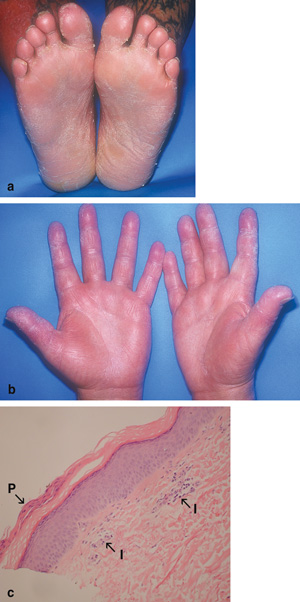 On physical examination, the patient was haemodynamically stable and looked well. His temperature was 37.2°C. There was erythema, tenderness and warmth below the right knee, consistent with cellulitis. There was desquamation of the skin of both his lower legs, soles of feet (Box, a) and palms and fingers (Box, b), as well as non-pitting oedema of the feet and hands. There was hyperkeratosis of the soles, with xerosis and an erythematous maculopapular rash of the arms. The skin condition did not appear typical of disorders causing hyperkeratosis and desquamation, which usually do not present concurrently. He had no mucosal ulceration. Differential diagnoses included the early phase of an exfoliative erythroderma, psoriasis triggered by infection, early pityriasis rubra pilaris, bacterial toxin-mediated exfoliation, viral exanthem, sarcoidosis and syphilis.