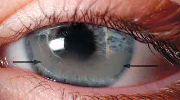 Anterior uveitis is the most common form of childhood uveitis.2 Anatomically, the inflammation involves the iris and the anterior part of the ciliary body. This form of uveitis is the type most commonly associated with JIA. Less common causes of anterior uveitis include herpetic uveitis, Behçet’s disease and Fuch’s heterochromic iridocyclitis.2 The insidious course and difficulty of diagnosis in preverbal children paves the way for the development of sight-threatening complications. Over time, even low-grade inflammation can lead to cataract, glaucoma, maculopathy and the band keratopathy which was demonstrated in this child. Over 75% of eyes affected by JIA-associated uveitis can develop one or more complications.2