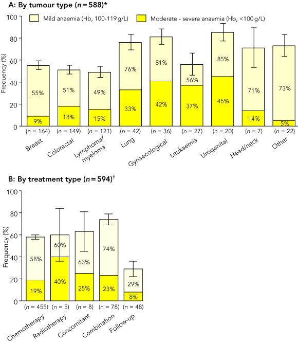 Our survey found that anaemia (Hb < 120g/L) was common among adults with cancer, with 57% of patients either having anaemia at enrolment or developing it during the following 6 months and 19% either having or developing moderate–severe anaemia (Hb < 100g/L). Patients who received radiotherapy as well as chemotherapy were more likely to have anaemia (73%) than those who received chemotherapy alone (58%) or those in the follow-up category not receiving cancer treatment (29%). Despite the high frequency of anaemia, 64% (208/323) of anaemic patients received no specific treatment for this during the survey.