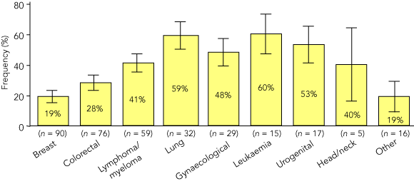 Frequency of moderate–severe anaemia (Hb < 100g/L) was 19% overall (110/588), and was highest in urogenital cancer (45%).