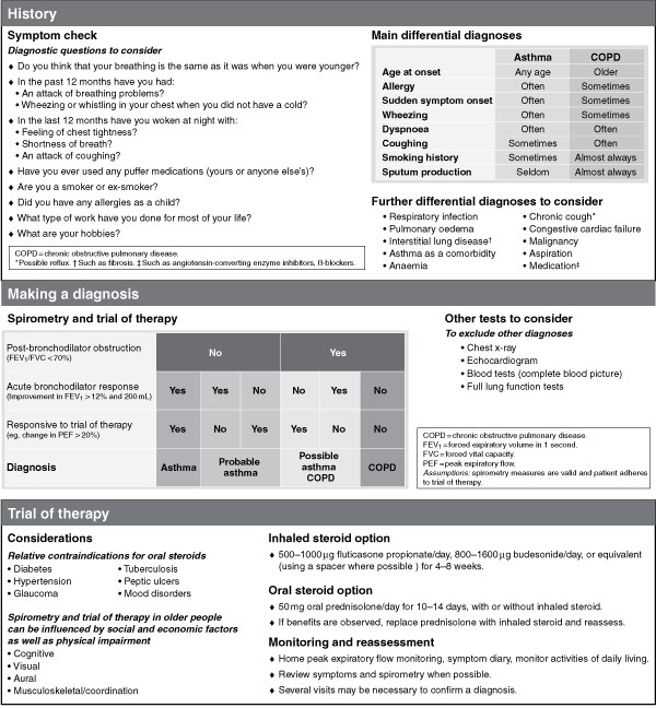 Arecent study has estimated that the prevalence of undiagnosed asthma in the adult population is 2.3%,1 and that this prevalence almost doubles in those aged over 65 years.2 Given that patients whose asthma is undertreated have worse outcomes, recognition of people with undiagnosed and untreated asthma is important.3 Although there is no Level I evidence4 to support the idea, an algorithm to aid the early diagnosis and treatment of asthma in older people may improve their respiratory outcomes. For the purpose of this discussion, we define an algorithm according to Stedman’s medical dictionary as a “step-by-step [written] protocol for management of a health care problem”.5 It is important to consider the issues associated with making an asthma diagnosis overall, and specifically in older people in whom other issues of ageing play a part, and whether these can be accommodated in an algorithm.