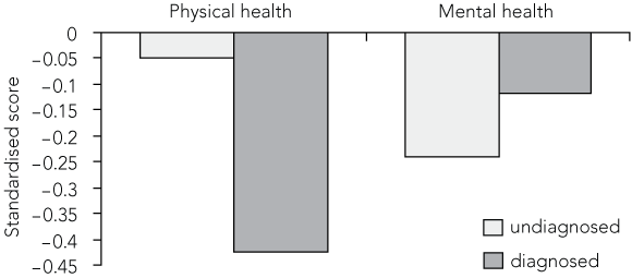The score for the physical and mental components summary of the quality-of-life questionnaire was significantly lower for both groups compared with that for the general north-west Adelaide population. The score for the diagnosed group was also significantly lower than that for the undiagnosed group (P < 0.01) (Box 3).