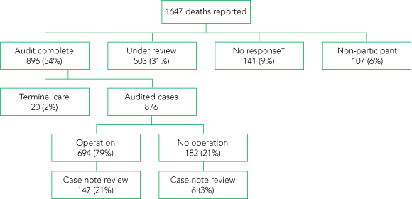 The WAASM was notified of 1647 surgery-related deaths between 1 January 2002 and 30 June 2004. Of these cases, 896 (54%) had been through a complete audit process by 30 September 2004, and 503 (31%) were still under review (Box 1). Terminal care accounted for 20 of the 896 audited cases (2%), and these were excluded from analyses. We report on the remaining 876 deaths, 153 (18%) of which had a second-line assessment.