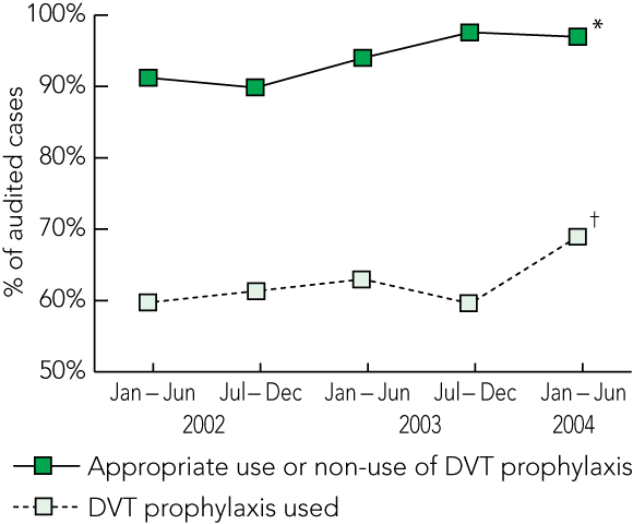 Surgeons indicated whether deep vein thrombosis (DVT) prophylaxis was used and, if not, the reason it was withheld. In turn, assessors indicated whether the surgeons’ decisions were appropriate. There was a significant increasing linear trend over time in the appropriate use of DVT prophylaxis as determined by assessors (P = 0.001, Box 7).