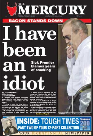 In February 2004, The Honourable Jim Bacon, Premier of Tasmania, aged 54, was diagnosed with advanced metastatic non-small cell lung cancer after a short history of dyspnoea and cough. He had been a heavy smoker. He made the diagnosis public, in the hope that by doing so he would contribute to the antismoking cause. Indeed, he famously pronounced on television “I have been an idiot” in not heeding advice to quit. Unfortunately, his disease responded only briefly to chemotherapy and radiotherapy and he died within 4 months of diagnosis.