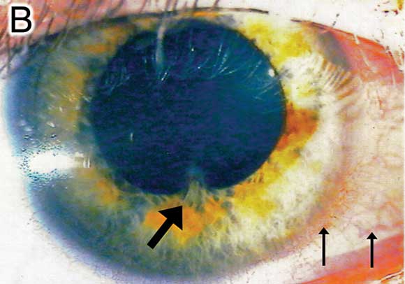 ![]() B: Photograph of the right eye of Patient 1, with the thick arrow showing pupil irregularity and posterior synechiae, and thin arrows showing inflammatory perilimbal injection. Keratic precipitates and anterior chamber cells are best appreciated on slit lamp examination. |