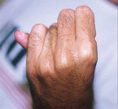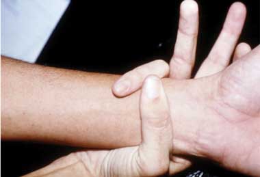 ![]() A. Pectus carinatum. ![]() B. Pectus excavatum. This must require surgey to be included in the major criterion (Box 1). ![]() C. Fixed flexion of the elbow. ![]() D. Pes planus. This is best diagnosed by examining the foot from behind. A valgus deviation of the hindfoot indicates pes planus. ![]() E. Arachnodactyly the wrist sign. ![]() F. Arachnodactyly the thumb sign. |