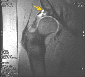 X-ray, arthrography and conventional MRI have all been found to be inadequate in diagnosis.3-5 In the last decade, gadolinium-enhanced magnetic resonance arthrography has been widely used to detect labral abnormalities, although more recent studies 6,7 have suggested that the sensitivity of this procedure may be somewhat less than first reported.3,8 More recently, fast spin-echo proton-density weighted MRI sequences taken in the plane of the hip joint have been shown to be more accurate.9