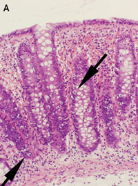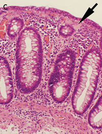 The pathogenesis of microscopic colitis is poorly understood and is thought to be related to a poorly regulated epithelial immune response to luminal or epithelial antigens including bile acids, toxins, or infectious agents.2 Microscopic colitis has been associated with autoimmune diseases and with exposure to medications, predominantly non-steroidal anti-inflammatory drugs, and, rarely, salicylates, simvastatin, ticlopidine, ranitidine, carbamazepine, Cyclo 3 Fort (a combination of Ruscus aculeatus extract, hesperidin methylchalcone, and ascorbic acid), flutamide, gold salts, and, recently, lansoprazole.2