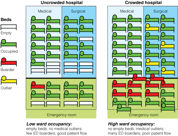 Our analysis examined the effect on mortality of overcrowding, as indicated by high hospital occupancy and high ED occupancy of patients waiting for an inpatient bed. Box 1 illustrates the difference between uncrowded and overcrowded conditions.