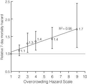 Testing for winter seasonal confounding revealed no significant effect. The Day 7 hazard ratio for overcrowded conditions after exclusion of 22 582 June to September admissions (36.1%) (hazard ratio, 1.3; 95% CI, 1.1–1.5; P = 0.002) was essentially identical to the Day 7 hazard ratio for the total study population in overcrowded conditions reported in Box 5.