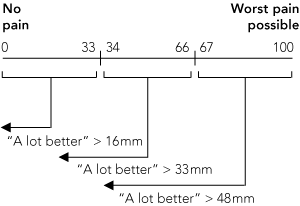 A clinically important reduction in pain was taken to be the reduction in the visual analogue scale (VAS) score equivalent to the patient description of “a lot better”, as defined by Bird and Dickson.17 This change in millimetres on the VAS is dependent on the baseline starting point and is 16 mm for an initial VAS in the range 0–33 mm, 33 mm for 34–66 mm and 48 mm for 67–100 mm. The figure shows a VAS divided into three and the associated reduction in VAS required to indicate a clinically important reduction in pain.