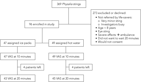 Ninety-six patients were enrolled, of a possible 369 people in the study (Box 3). Forty-nine were treated with hot water and 47 with ice packs. All randomly assigned patients underwent their designated treatment and completed a VAS at 10 minutes, but eight patients did not remain for the 20 minutes (Box 3). The two groups had similar baseline features, except patients treated with hot water had more severe initial pain than those treated with ice packs (Box 4).
