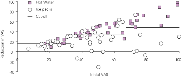 Patients receiving hot water and patients receiving ice packs are divided into three groups based on their initial VAS (see Box 2). The black lines divide patients who had clinically important reduction in pain (above the line) from those who did not (below the line).