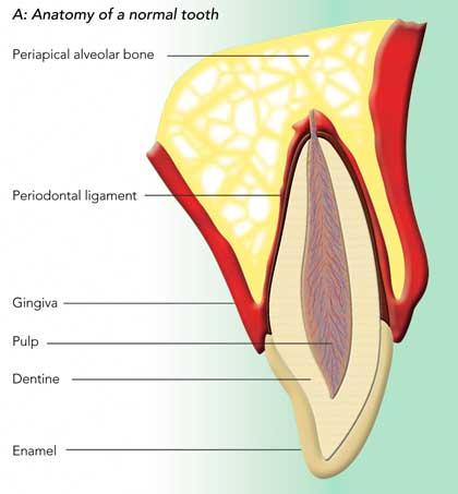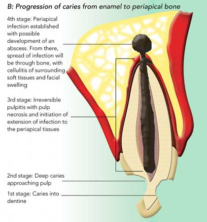 The anatomy of a normal tooth is shown in Box 1, A. Caries extending from enamel into dentine usually causes some sensitivity and pain. The dentine consists of fine tubules that contain cellular processes and afferent nerve fibres surrounded by dentinal fluid. The “hydrodynamic theory” proposes that the fluid moves back and forth to stretch, compress, and excite the nerves in the pulp (the highly vascularised and innervated connective tissue in the central cavity of the tooth). For pain to be felt, the dentine must be excited by a noxious stimulus, either hot or cold, sweet or sour, or touch. The pain is best described as a sensation of sudden shock and is sharp in nature. It is never spontaneous in onset.2