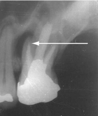 Periapical intraoral x-ray of left upper molar: a radiolucent area (arrow), denoting periapical abscess formation, is seen adjacent to one of the roots of the first upper molar, which is heavily restored and has a root canal filling.