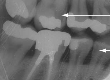 Areas of radiolucency (arrows) denote carious lesions. Neither the caries in the upper first molar (beneath an amalgam filling) nor that in the lower first premolar (on the surface adjacent to the next tooth) will be visible clinically.