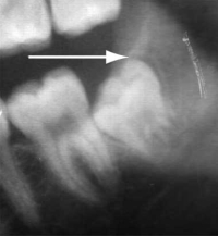Segment of an orthopantomogram showing an impacted wisdom tooth: a radiolucent area (arrow) is seen behind an impacted right lower wisdom tooth from a patient with pericoronitis.