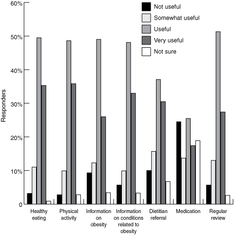 Results: Most patients (78%) felt that GPs had a role in weight management, but only 46% thought that GPs would be able to spend enough time to provide effective weight loss advice. Over 80% of patients perceived advice on healthy eating and physical activity to be useful or very useful, and were likely to follow weight-loss recommendations; 78% were in favour of regular review. Patients indicated they would be less likely to see a dietitian or to attend information sessions, and unlikely to take weight-loss medication. Views of overweight and obese patients were generally similar to those of normal weight patients, but there were significant differences in perceptions of the usefulness of information on weight and weight-related medical conditions, as well as willingness to change lifestyle, possibly reflecting resistance to change among obese or overweight patients.