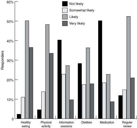 Patients expressed positive views about receiving lifestyle advice, such as dietary and physical activity guides from their GP. These options were favoured over medications and dietitian referral. There is evidence that nutritional counselling can produce improvement in weight.13 The results are encouraging for the effectiveness of strategies like the SNAP (smoking, nutrition, alcohol, and physical activity) framework14 and the Lifescripts resources.5
