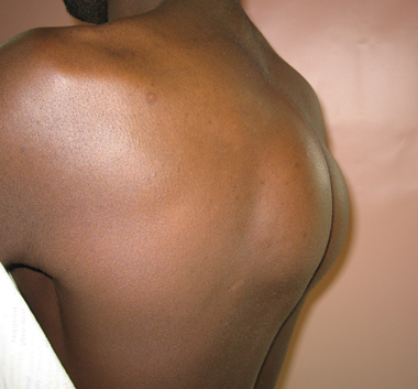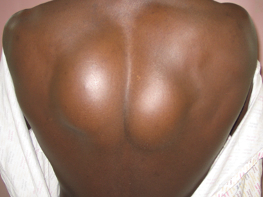 Over the preceding 3 months, he had gradually developed symmetrical masses on either side of the thoracic spine (A and B). He denied any respiratory symptoms, fever, sweats or weight loss. On examination, he was afebrile and both masses were fluctuant but not tender or inflamed. Spinal movement was unrestricted and no features of spinal cord compression were present.