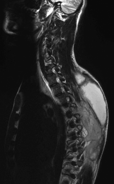Blood tests showed a normal white cell count and differential, a C-reactive protein level of 180 mg/L (reference range, 0–4 mg/L), and an erythrocyte sedimentation rate of 64 mm/h (reference range, 0–15 mm/h). HIV serology was negative. Magnetic resonance imaging of the thoracic cord showed large, bilateral collections within the rectus spinae muscles extending between T3 and T10, and destruction of the spinous process of T5. There was also high signal in the facet joints at this level, suggesting an infection arising from them (C).