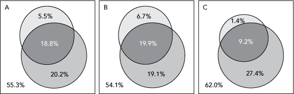 2 Venn diagrams showing the proportion of patients perceived as having impaired kidney function by their general practitioner (lower circle) and the proportion with a creatinine clearance of < 60 mL/min estimated by the Cockcroft–Gault formula (upper circle, A) or by the GP (upper circle, B), or by elevated serum creatinine levels (upper circle, C), and the overlap of these groups (central dark area)