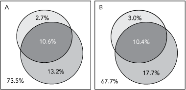 3 Venn diagrams showing the proportion of patients with elevated serum creatinine levels (upper circle) and the proportion with a creatinine clearance of < 60 mL/min estimated by the Cockcroft–Gault formula (lower circle, A) or by the GP (lower circle, B), and the overlap of these groups (central dark area)