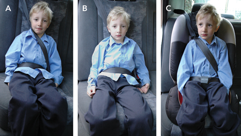 Adult seatbelts and car seats are designed to protect adult passengers. Children are shorter than adults, have relatively larger heads, and underdeveloped iliac crests. As a result, the sash portion of an adult seatbelt tends to lie across a child’s face or neck (Box 1A) and the lap portion rides up across the abdomen (Box 1, A and B).15,18-20 Poor fit is exacerbated by the “slouch factor”, as children tend to sit slumped in their seats. As the seatbelt is uncomfortable, children are likely to misuse it by placing the sash portion under the arm or behind the back, effectively converting a lap-sash belt into a lap-only belt.11,13,14,21 In an accident, incorrect seatbelt positioning or misuse increases the risk of intestinal perforation and mesenteric disruption due to “jackknife” forces on the lap portion of the belt, and head injuries due to excessive head excursion, allowing the head to make contact with the child’s lower limbs or the vehicle’s interior.11,21,22