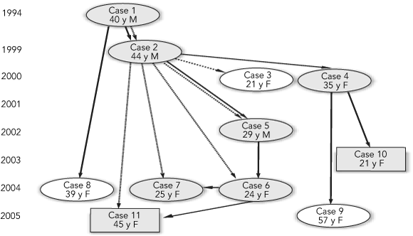 Routine genotyping has the potential to detect unsuspected clusters, and would likely have identified this group earlier if testing had been available before 2003. The delay in identifying the cluster reinforces the limitations of relying solely on traditional contact tracing, particularly in hard-to-reach populations.9 Molecular epidemiological studies have demonstrated that as few as 5%–10% of clustered cases are identified through routine investigation of close contacts.2,10,11 Factors contributing to this low success rate include the importance of casual contact in transmission and the fact that cases do not necessarily disclose all contacts.
