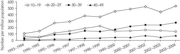 The number of separations with drug-induced psychosis as the primary problem among those aged 10–49 years increased from 55.5 per million population in 1993–1994 to 253.1 per million population in 2003–2004. This increase was most marked among older age groups: the age-specific rate increased fivefold among those aged 20–29 years, sixfold among those aged 40–49 years, and eightfold among those aged 30–39 years, compared with the rate among those aged 10–19 years, which was less than doubled (Box 1). Across this period, age-specific rates of drug-induced psychosis separations were consistently highest among those aged 20–29 years.