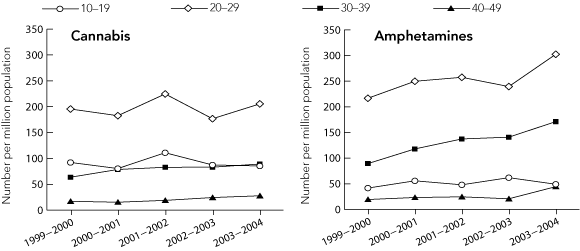 Although hospital separations due to both cannabis- and amphetamine-induced psychosis (raw numbers and age-specific rates) were highest among those aged 20–29 years (Box 3), these figures do not take into account the relative number of users of the drugs. The number of hospital separations in 2003–2004 due to cannabis- and amphetamine-induced psychosis per million users of each drug showed a distinctly different age pattern. The estimated number of cannabis-induced psychosis separations per million cannabis users was highest among the youngest age groups. In contrast, the estimated number of amphetamine-induced psychosis separations per million amphetamine users was highest among the older age groups.