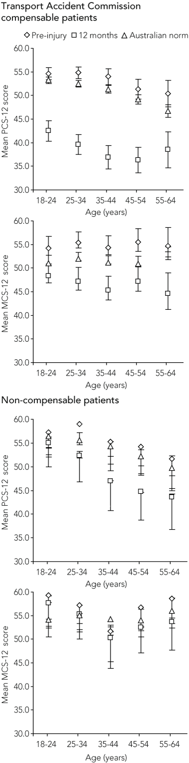 Box 3 summarises the SF-12 results for the two groups. Compensable patients had mean pre-injury PCS-12 scores above, but similar to, the population norms. By 12 months after injury, PCS-12 scores had not returned to pre-injury levels and were below population norms in every age group. A similar pattern was seen for non-compensable patients. Compensable patients reported pre-injury mental health status scores above population norms. At follow-up, MCS-12 scores remained below population norms for compensable patients. This pattern was not seen for non-compensable patients.