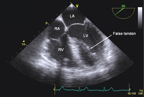 The incidence of false tendons — fibromuscular intracavitary bands anatomically distinct from the valvular cusps — is 0.4% to 3.0%.1 They may be associated with malignant ventricular arrhythmias, which should be excluded before making a diagnosis of benign premature ventricular complexes in a healthy patient.1