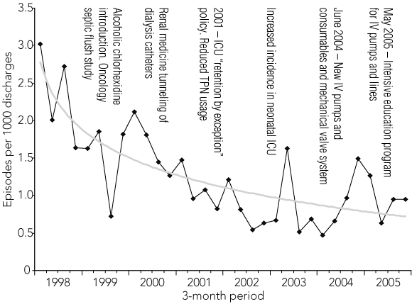 The decline in IV catheter-related BSIs was associated with multiple interventions. Individual units instigated many of these, usually in consultation with the infection control service after receiving feedback and advice about their rates and numbers of IV-related BSIs (Box 6). We believe our surveillance program was the catalyst for many of these interventions, which may otherwise have been introduced later or not at all.