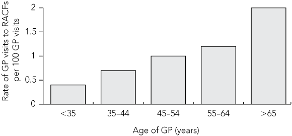 Younger GPs have much lower rates of providing services to RACFs than older GPs. RACFs are becoming increasingly reliant on an established cohort of older, predominantly male GPs who themselves may soon be reaching retirement age (Box 2).6,13